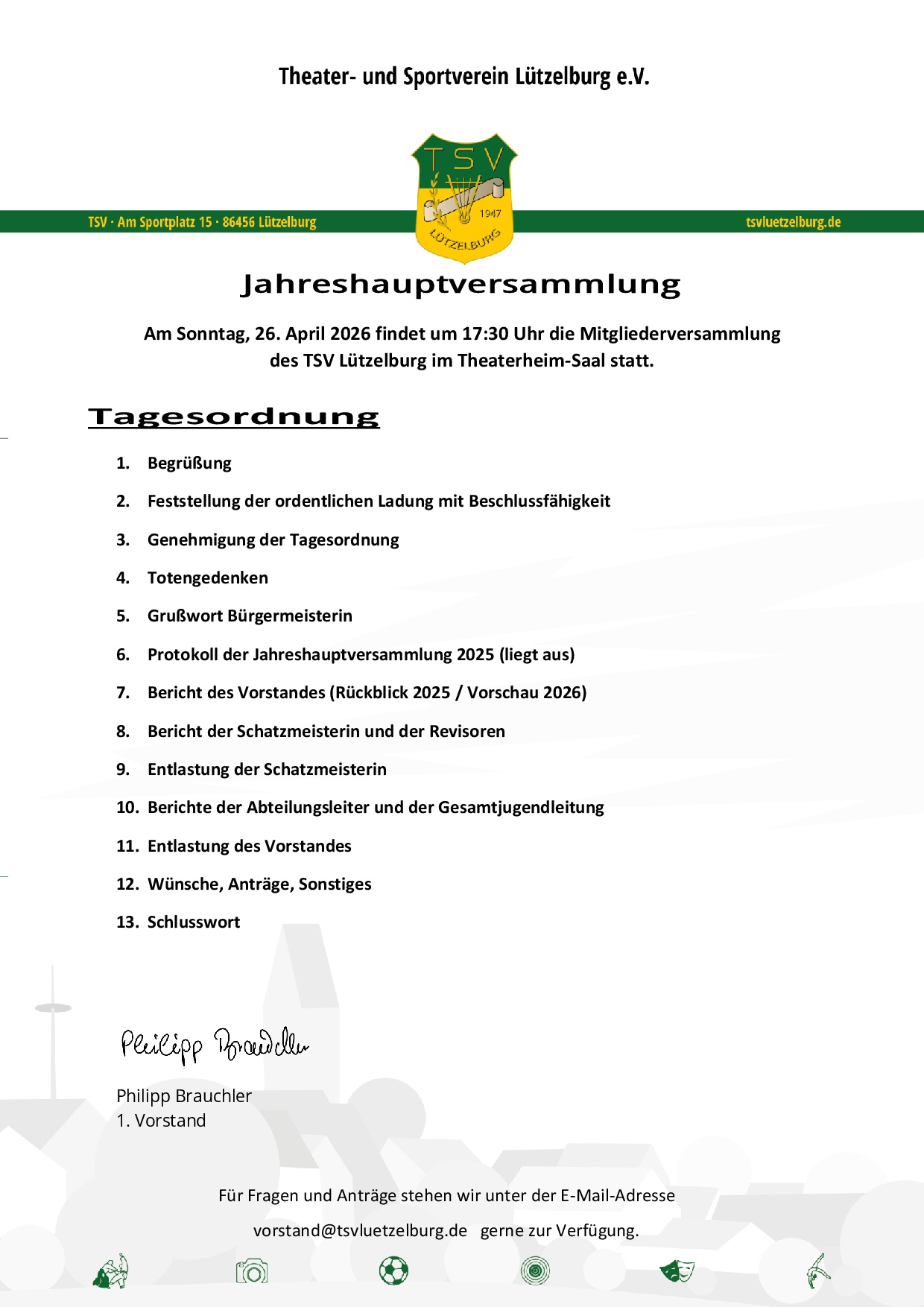 Einladung zur Mitgliederversammlung12. April 2026/in Aikido, Fotofreunde, Fußball, News, Schützen, Theater, Turnen, Verein TSV-Jahreshauptversammlung 2026 – TOPs https://tsvluetzelburg.de/wp-content/uploads/2023/04/Wahlen_Hand.jpg 602 1280 TSV /wp-content/uploads/2020/02/logo-tsv-luetzelburg-header.png TSV2026-04-12 18:48:002026-04-12 18:49:37Einladung zur Mitgliederversammlung
